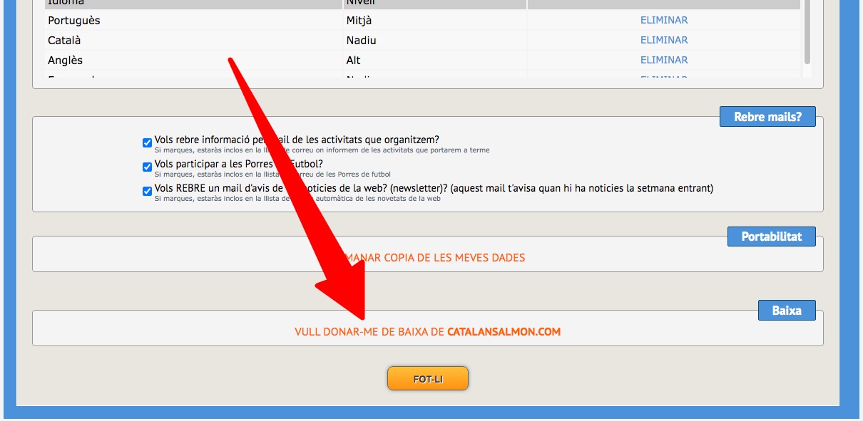 Fes login, vés a la teva fitxa, i a la part de baix trobaràs un link vull donar-me de baixa de catalansalmon. Simplement clica-hi, deixa-hi algun comentari si vols, i confirma la baixa. Res més.