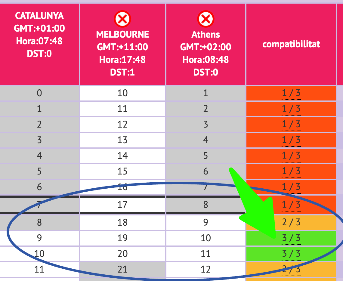 | 22 | 3 (+1D) | 2 (+1D) | 0 / 3Aquesta hora li va be a 0 de les 3 franges horàries; es a dir que te un 0% de compatibilitat | les 22 de CATALUNYA / les 3 (+1D) de MELBOURNE / les 2 (+1D) de PORTLAND(Oregon) |